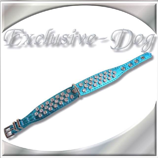 Dieses kleine Strasshalsband wurden aus metallic blau farbenen Nappaleder hergestellt,