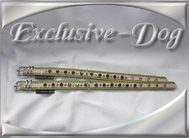 Diese XS Strasshalsbänder wurden aus aus grün/rosa farbenen Nappaleder hergestellt,