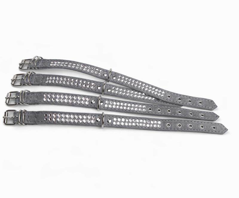 Diese kleinen Strasshalsbänder werden aus sehr weichem grauen Veloursleder gefertigt und mit hellem Leder unterlegt.