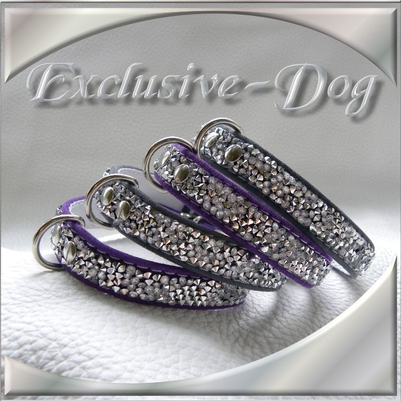 Diese kleinen Strasshalsbänder wurden aus sehr weichen grauen sowie lila Veloursleder hergestellt,
